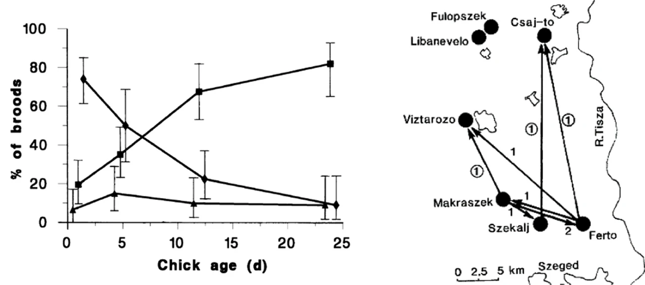 Brood care pattern in relation to chick age (left) and movement of Kentish plover pairs (right, uncircled numbers) and divorced individuals (circled numbers) in Southern Hungary (Székely & Lessells 1993).
